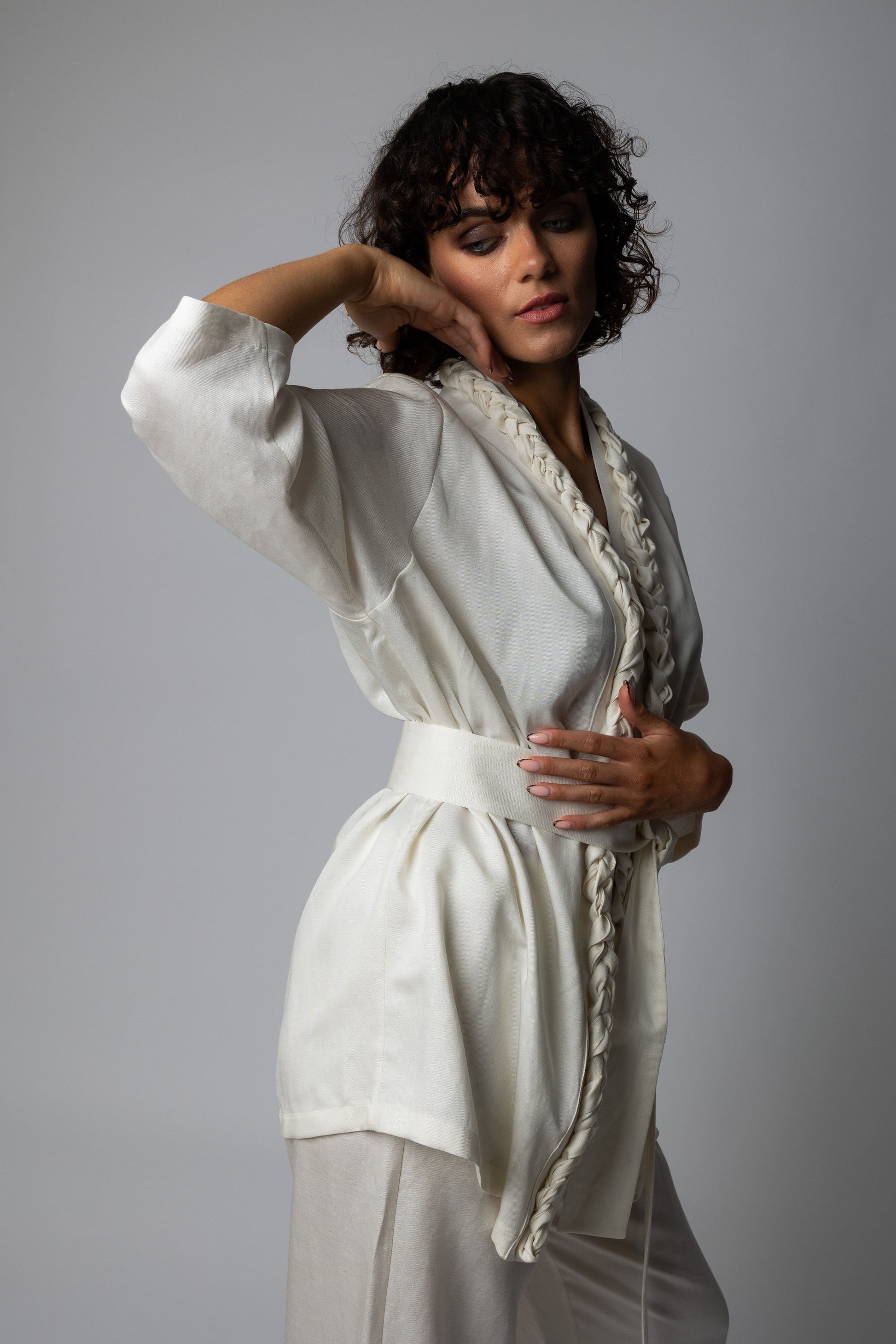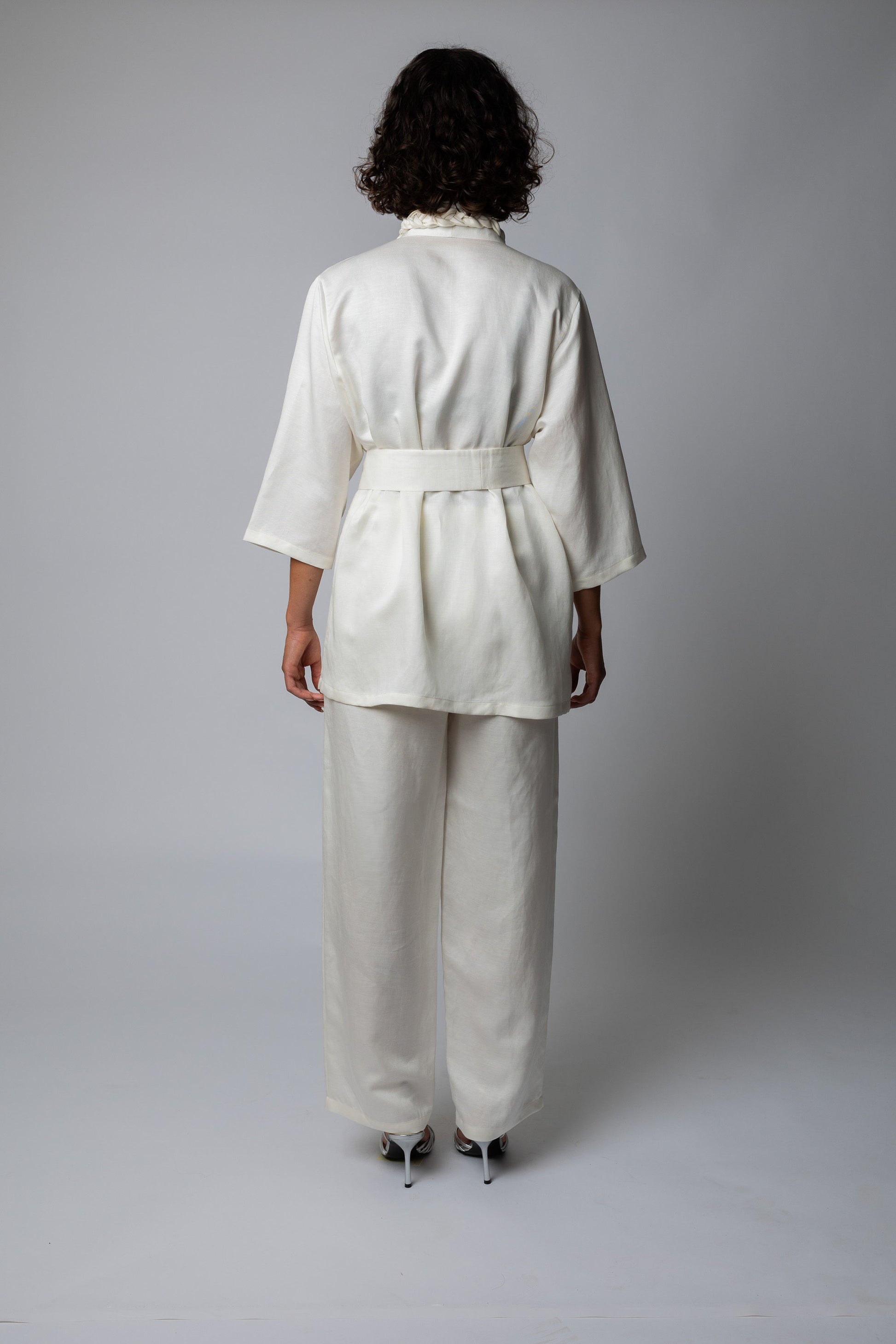 Divdaļīgs bikškostīms – bikses un kardigans ar jostu . Aizdare biksēm – rāvējslēdzējs,